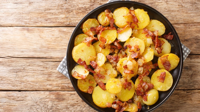 Potato chips are just one way to spruce up canned potatoes using an air fryer. Consider creating a vegetable stir-fry as well. Add some bell peppers, onions, or garlic alongside your potatoes for a medley of flavors. The heat from the air fryer will cause the onions and peppers to caramelize, imparting sweetness to the potatoes. If you desire some savoriness, add a few cuts of bacon to the mix. An air fryer can crisp bacon perfectly to crumble atop your potatoes. Combine with a dash of salt, pepper, and rosemary to bring it all together.