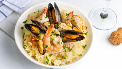 Risotto generally also includes butter, white wine, stock, alliums, and herbs. You can also make risotto with mushrooms, veggies, or seafood. After toasting the rice and sauteéing the aromatics, the stock is added to the rice a little at a time, with constant stirring to gradually incorporate it. The result is a silky, creamy, porridge-like mixture that's soft yet toothsome, and packed with a symphony of comforting flavors.