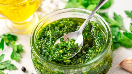 In terms of appearance, persillade sauce looks nearly identical to chimichurri, but there are more differences than just their originating cuisines. Though there is a good amount of overlap in the ingredients, chimichurri contains a blend of herbs rather than just parsley. Typically, it also includes cilantro and oregano, and you can even add kale. Instead of the green onion used in persillade sauce, chimichurri uses red onion, and because of the addition of red pepper flakes, chimichurri also packs a bit of heat. Persillade sauce on the other hand is not spicy.