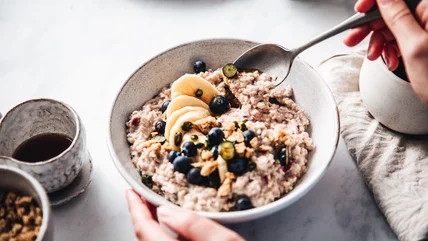 But while the ingredients may be roughly the same, the preparation for the two isn't. Granola is sweetened, baked, and crumbled, which is what gives it that hard, crunchy texture, and clumped-together consistency. It's often served with milk as a counterbalance to this, or on top of yogurt, and almost always eaten cold. Muesli, meanwhile, is by definition raw and loose. You can eat muesli straight up or with milk, like granola, or boil it to create a porridge-like slurry. However, the most common preparation is to soak muesli overnight in milk, yogurt, or juice and eat it cold (like Bircher muesli, which is said to be the original version of overnight oats).