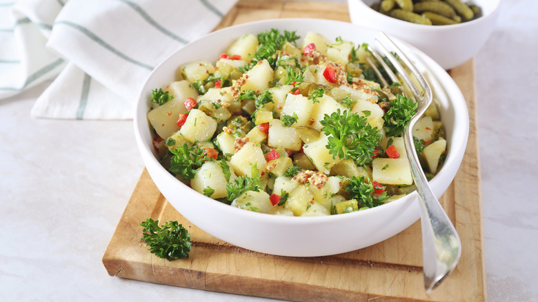 Often seen alongside huge spreads of barbecue at cookouts across the South, or sitting pretty in the glass cases of delis across the North, potato salad is a popular side dish all across America. While this creamy appetizer might be a common sight on dinner tables throughout the United States, potato salad is actually enjoyed around the word. In fact, it's a beloved dish in Europe too, especially in countries such as Germany and Austria.