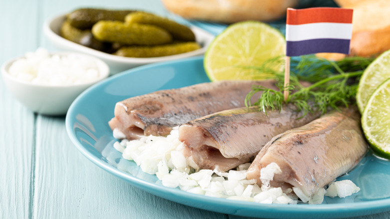 If you peruse the internet in search of herring-eating tips for your next trip to Holland, you'll learn that the local custom is to grab the entire fish by the tail and eat it whole. It typically has had its head, scales, and bones removed; then, it's frozen and lightly cured with salt for a few days. So, while it's technically not raw, it's also not like eating a piece of grilled fish. This style of eating herring is known as haringhappen, and it's mostly done when the new (young) herring season starts in the summer. People in the Netherlands also like to perform this ritual on holidays, especially on Ash Wednesday after Carnival is over.