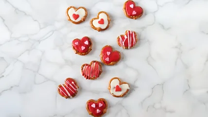 By melting white chocolate or candy, you can easily fill each pretzel. Add some heart-shaped sprinkles, and it's a beautiful Valentine's Day treat that will have you filling up your bowls and snacking away through the rest of the month. Here's an exciting look into how you can make these Valentine's Day–themed pretzels yourself.