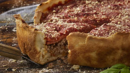 While regular pizza commonly consists of cheese on top of the sauce, traditional Chicago deep dish pizza has cheese on the bottom, which acts like a moisture barrier, preventing the wet sauce from turning the thick crust into a soggy mess. Another reason the sauce is layered over the cheese is to prevent it from burning since deep dish pizzas have to cook significantly longer than thin or hand-tossed varieties.
