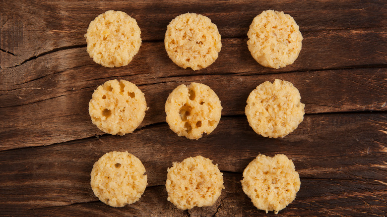 The cheese you choose for this crunchy snack determines the flavor, texture, and overall vibe of the cheese crisps. A firm, low-moisture cheese is your best bet for high-quality cheese crisps. Parmesan, cheddar, and Gruyère are great selections for ultra-crunchy cheese crisps. Unfortunately, some cheeses just won't work for this air-fried finger food. The goal is to make them crispy, so fresh cheeses like mozzarella, feta, or ricotta, which contain more moisture, may not be suitable for achieving a proper crunch. Similarly, ultra-soft cheeses like brie or camembert take on a viscous texture when heated, which makes them ideal for dipping crackers and bread into, but not so much for a crispy treat.