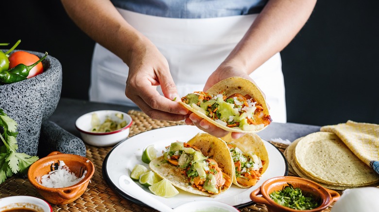 Onion, garlic, vinegar, and spices round out the primary elements of the al pastor marinade. Some marinades include pineapple, which is great for whatever meat you'd like to use. Pineapple juice has a special enzyme that helps tenderize the meat. If you go this route, make sure not to leave the meat in pineapple juice marinade for more than 12 hours. Just be sure to thinly slice the meat, and top it with pineapple, chopped onion, and cilantro for a streamlined experience that's as close to authentic as you can get.
