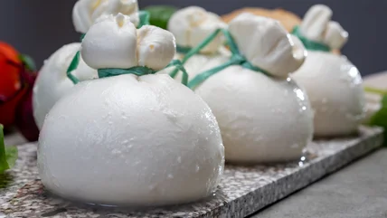 Mozzarella is likely the most famous fresh cheese of all. There are different varieties of mozzarella based on the region it's made. But generally speaking, look out for a mozzarella that's pearly white, has plenty of bounce and elasticity, and has a smooth outer surface. And the bit of white liquid that seeps out when you cut into it? That's the whey liquid it's stored in — also a good sign of quality and freshness.