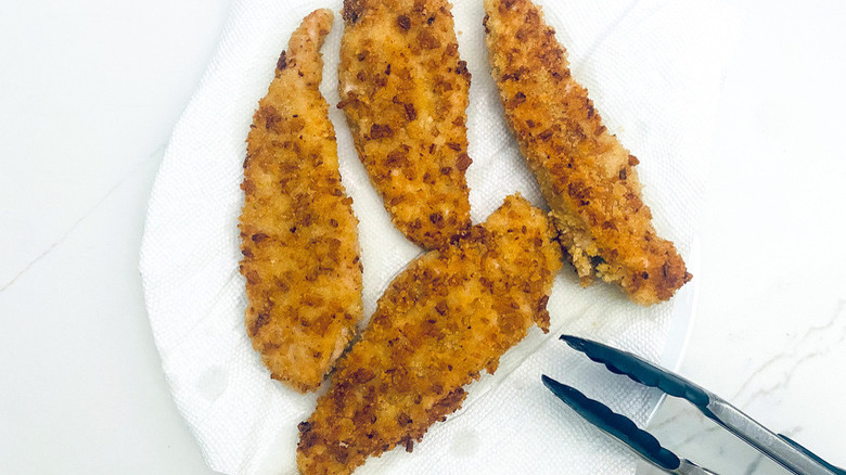 When your favorite fast food chicken nuggets from childhood grow up, they morph into these incredibly delicious crispy chicken tenders. These tenders are a play on a classic schnitzel recipe, using pulverized crispy fried onions, à la green bean casserole fame, to coat the chicken before pan-frying it to golden perfection.