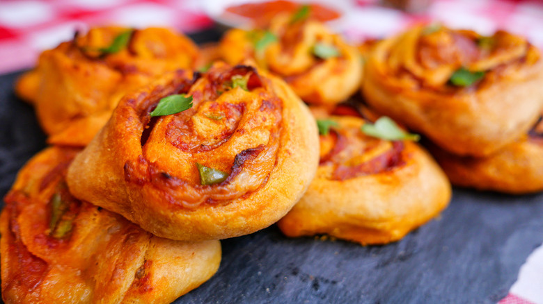 Though you can keep things simple with pepperoni, pizza sauce, cheese, and peppers, feel free to swap out any ingredients. You may want to make some of these with green pesto instead of the red sauce, or use different kinds of cheese like Cheddar, pepper jack, or Swiss. Lastly, you could use any cured meat, including prosciutto, salami, or mortadella.