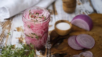 A slow pickling method will also help preserve the crunch of your onions. Prime your onions for the brine by pre-soaking your onions in a bowl of salt water for one hour, which will help soften the harsh bite of the onions. In the meantime, boil your brine so that all of the flavors of your ingredients can infuse together, and then allow it to cool completely. Drain and rinse the onions when they're done soaking, and then combine the onions and brine into a tightly sealed jar and place it into the fridge. In three days, you'll be able to enjoy crunchy pickled onions that have maximum depth of flavor.