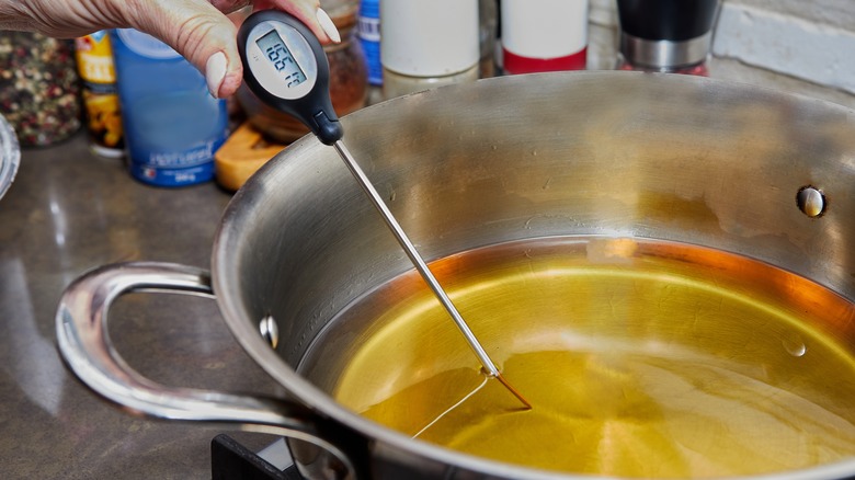 Generations of cooks have passed down the "wisdom" that tossing a bit of flour into the oil to see if it bubbles is the best way to check if the oil is ready for frying, but this is not wisdom at all. It is another myth. One of the biggest issues home cooks have with fried chicken is that it often comes out either soggy or overcooked, and this is why. Oil needs to be a precise temperature to fry perfectly, and the only way to know if it has hit that temperature is to check it with a thermometer. You should check it before the chicken goes in, as well as in intervals as it cooks to make sure that the oil is maintaining the ideal temperature of 350 degrees Fahrenheit.