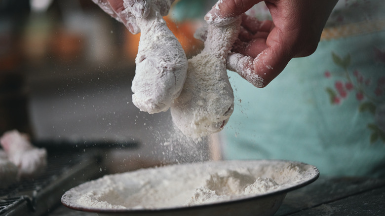 Sure, everyone's favorite part of fried chicken is that delicious crispy coating, but this is a case where too much of a good thing is bad. Trying to double up on the flour to create a second layer of breading will not make a better piece of fried chicken — in fact, it will most likely only lead to disaster. Your chicken should only make one pass through the flour, otherwise it won't cook properly. The chicken inside will no longer be the star of the show either, and the people who you are serving it to will be too busy wondering if they need a dentist to be able to enjoy it.