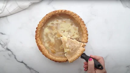 Now, while you might think that the pie will come out of the oven liquidy, it actually forms a sort of gelatinous filling. As the pie bakes, the heat from the oven causes the butter to emulsify and the sugar to melt into a liquid, spreading throughout the watery filling. At the same time, the flour in the mixture acts as a thickener, just like it would if you were making a custard or a roux. This is thanks to the starch in it, which leaks into the filling, helping it to set. The result is a pie filling that's reminiscent of pecan pie — minus the nuts, of course. Although it's a bit unconventional, it's still deliciously tasty!