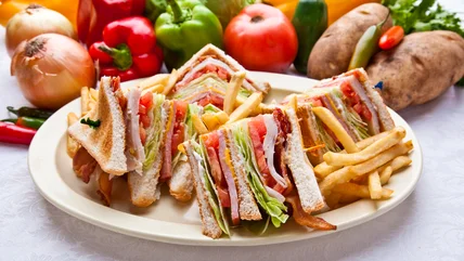 The club sandwich — that crispy triple-decker delight found on diner and deli menus nationwide — is a standard lunch staple. Formed with the support of three pieces of bread, the classic club sandwich includes turkey or chicken, bacon, lettuce, tomato, cheese, and a healthy spread of mayonnaise. Whether served with chips or a pickle, this sandwich makes for the ultimate quick snack or meal.