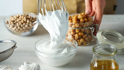 Although it might seem strange, when you cook chickpeas, some of the proteins and sugars in the legumes leak out into the water. This creates a liquid that has a very similar makeup to egg whites. The result is that you can use it in much the same way, whipping it up into foamy meringues or using it as a binding agent.