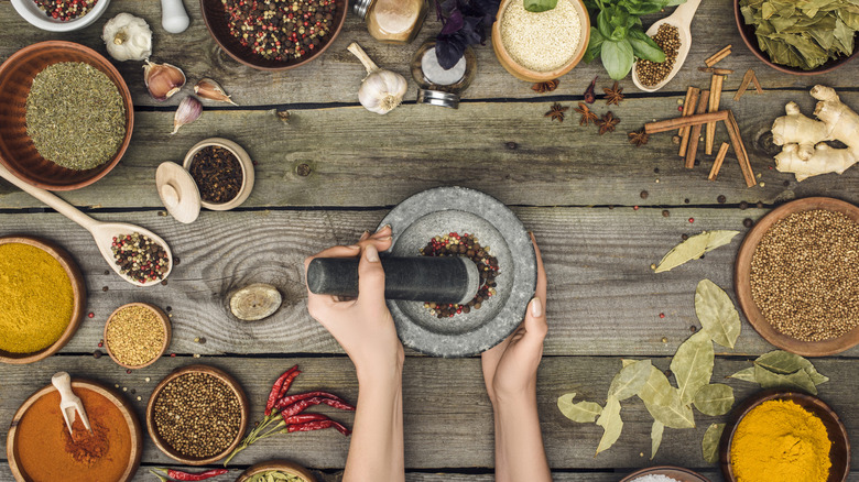 Making custom popcorn seasoning at home is much easier than you might think. Once you've chosen the ingredients you want in your seasoning blend, it's time to combine and grind. Just make sure that any herbs, spices, or other components you add are already dried because moisture can mess with the texture of your seasoning blend and make it clumpy. This is especially important if you're storing any seasoning mix in an airtight container for later because moisture in the mix can lead to mold.