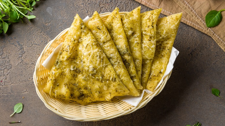 When it comes to uncommon grilled cheese ingredients like pesto, it helps to consider some unexpected bread selections. Crusty Italian bread has all the qualities you need when making a grilled cheese sandwich featuring a smattering of pesto. The bread is thick and dense, which means it will be robust enough to handle the cheese and sauce without falling apart. If you want things to be extra cheesy, consider using focaccia bread instead. Another product of Italy, focaccia typically features added ingredients like cheese, roasted peppers, rosemary, olives, and garlic. While technically a flatbread, focaccia serves as a sturdy foundation for a stacked grilled cheese.