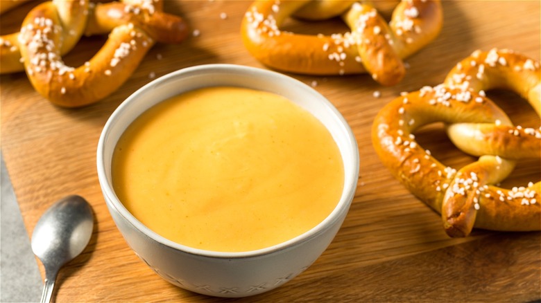 Many parties and get-togethers often include a variety of favorite hors d'oeuvres and snack-friendly appetizers for guests to enjoy. Next to pigs in a blanket and pesto brie bites, who can resist homemade pretzels dipped in luscious and creamy beer cheese? Primarily crafted from milk, butter, and melted cheddar, plus a bit of beer, the dip might lead some to wonder if it includes enough alcohol to feel a booze-induced impact. Rest assured, while beer cheese does contain alcohol, it's typically not enough to give anyone a buzz.