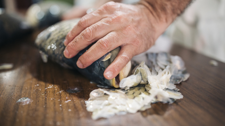 Whether you're prepping a whole branzino from the fishmonger or a stringer full of perch that you caught yourself, you'll need to properly scale the fish before moving into the cooking phase. Slimy and potentially messy, the scaling process can be a bit intimidating and mysterious, especially the first time you give it a go. Luckily, you probably already own the only tool you need to properly scale a fish: a good chef's knife. Simply slide the back side of the knife over the scales to remove them from the skin, leaving behind a smooth surface perfect for cooking.