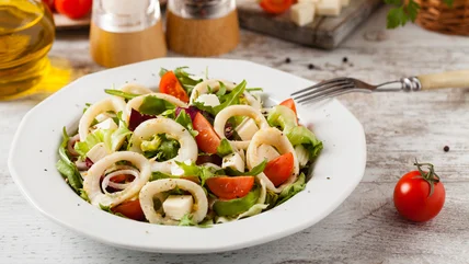 If you're making your first foray into calamari salad, frozen squid is a convenient option to consider. Most grocery stores have frozen calamari stocked in the seafood section, and you'll likely have a few choices at your disposal. For instance, some frozen calamari are already chopped into smaller pieces for your convenience. In this case, you simply need to thaw and cook the pieces before incorporating them into your salad.