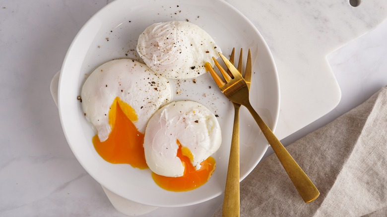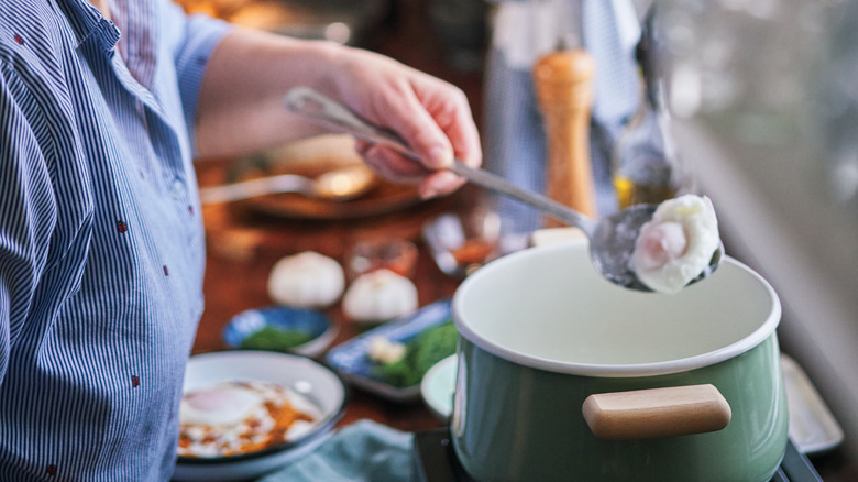 Mei Lin, internationally acclaimed chef and Top Chef winner, likes to start prepping her poached eggs about 30 minutes before she starts cooking them by cracking them into a bowl of two parts water to one part vinegar. In a TikTok for The Food Network, she explains that this creates a film that holds the structure of the egg white together. By putting the eggs in just barely bubbling water instead of a rolling simmer, they aren't agitated. The result is not only a whole batch of poached eggs ready to serve at the same time but also maybe the prettiest poached eggs you've ever made.