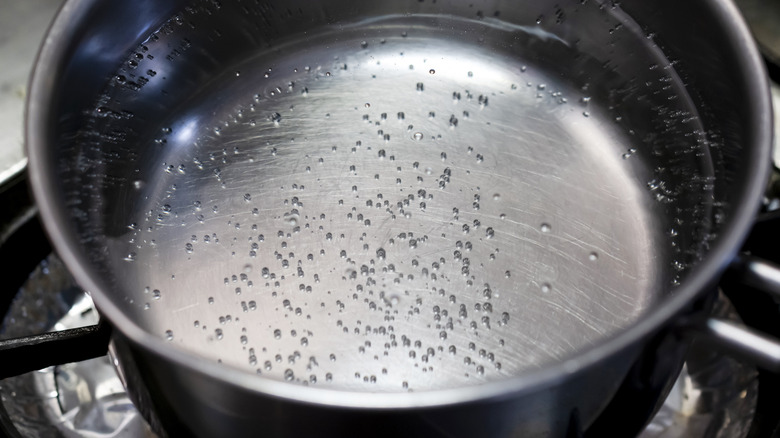 We know that a full boil is achieved at 212 F. But the stage of a simmer spans from 140 to 195 degrees. From 140 degrees to 170 degrees is a stage known as a quiver simmer, where little bubbles will form but not break to the surface. That's the temperature range you're going for here for gently poached eggs, and the temperature Mei Lin demonstrates in her video.