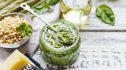 If you're hoping to extend your pesto sauce beyond its five-day lifespan, you can always stick it in the freezer. Opened pesto that has not yet reached the five-day mark can be frozen for up to six months without going bad or developing a drastic change in flavor. There are two different ways to freeze pesto. You can portion the sauce into cubes by filling an ice cube tray to freeze and use only the cubed amount you need for recipes. A standard tray holds about one ounce of liquid per cube, which will make for easy reference when deciding how much pesto you need to defrost. You can also freeze your remaining pesto in a glass jar if you plan on using the entirety of your leftovers when it thaws.