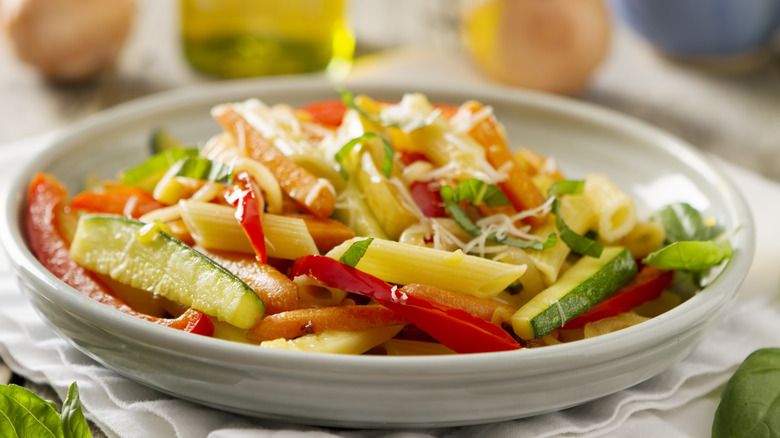 For one, the sauce is made of chicken broth, so you still have liquid for your pasta. Don't worry about missing out on cheese, though, as pasta primavera is typically tossed in and topped with parmesan cheese. This type of cheese is surprisingly healthy for you; not only is it lactose-free, but it's also low in fat and chock full of protein. A single ounce has 10 grams of protein, which is around 20% of what you need in a day, typically. Add in some salt and pepper and then top with basil, and pasta primavera is a refreshing yet light dish.