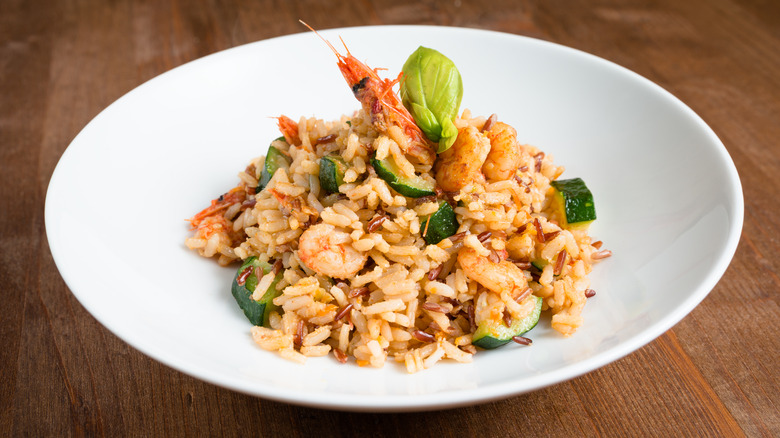 If you don't like plain risotto, then choose the version with shrimp and zucchini in it. The shrimp gives you a flavorful hint of the sea, especially when cooked with garlic. Not only are shrimp low in calories and fat, but they're also packed with protein; a 3-ounce serving provides you with 20 grams of it. The zucchini allows you to get your greens in during dinner, and its mild taste makes it easy to go down. The bonus is that 1 cup of it gives you 40% of your daily recommended vitamin A intake and 14% for vitamin C.