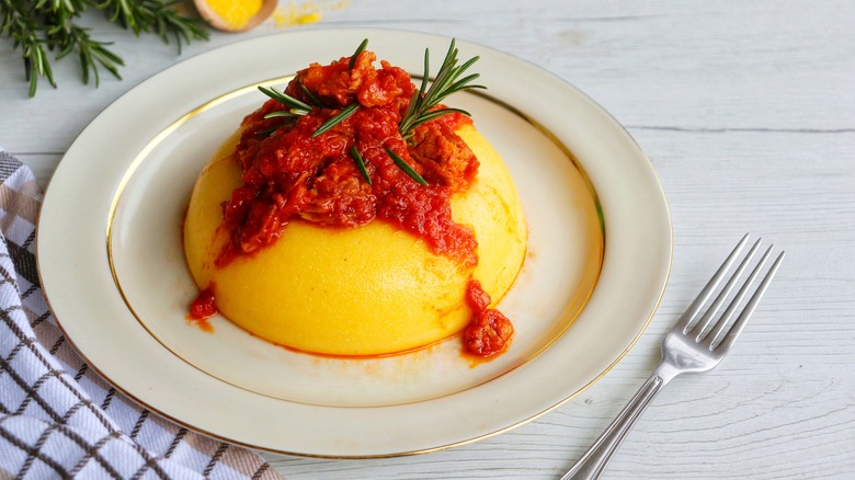 Admittedly, polenta on its own can be a little boring. If the novelty of plain polenta has worn off for you already, then try it with some marinara sauce. Not only does the sauce give the dish a nice acidic kick, but it makes it not so dry, too. In addition, consuming marinara sauce is essentially the same as getting a serving of veggies since you'll get over 20% of your daily vitamin A and E needs in one go. Do note that it can be high in sodium, so if you're watching your salt intake, it's okay to leave some marinara sauce behind on your plate.