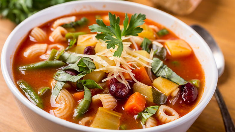 The good news is that it's not all junk, either. The beauty of minestrone is that it's very versatile, as restaurants will use whatever meats and vegetables are available; if you stick to a plant-based diet, there are equally delicious vegetarian versions available, too. Whether meat is included or not, the soup is filled with veggies, such as celery, carrots, and zucchini, which can easily help you meet your daily required intake. This ensures that your body gets the vitamins and minerals needed to be strong and healthy.