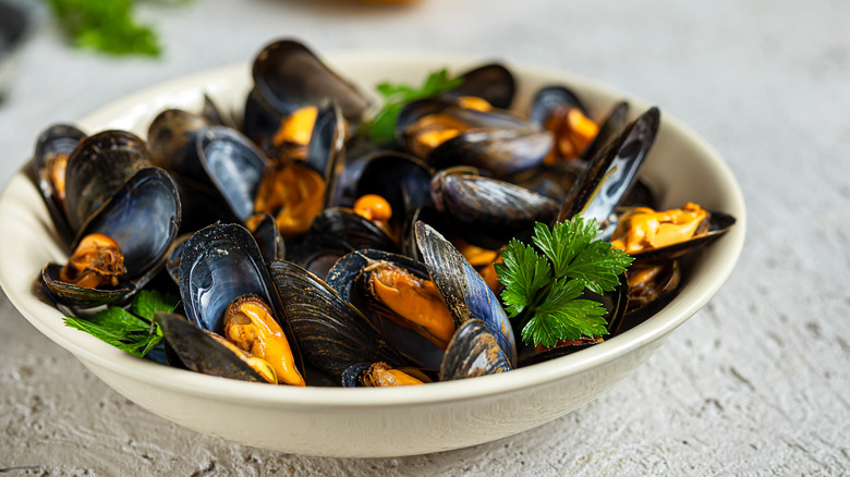 An outstanding shellfish option is white wine mussels in aromatic herbs. Herbs are always the key to upgrading dishes from bland and boring to tantalizing for the taste buds, so you can't go wrong here. What's awesome is they enhance flavors while offering health benefits such as fighting inflammation and lowering cholesterol levels. As for the main star, they're steamed with a small amount of olive oil and butter, so the dish isn't very fatty. Mussels are also packed with protein, vitamins, and minerals while remaining relatively low in calories. Plus, when cooked correctly, mussels are served with their shells open, so you don't have to deal with messy peeling like you would with things like shrimp.