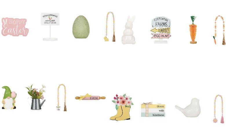 Whether you're decorating a tray or other home surface, Aldi's variety of tray objects brings a springtime mood into any space. Four sets are coming to stores. One features a pink "Hoppy Easter" sign, a Peter Cottontail carrot patch sign, a green speckled agg, and a beaded bunny charm. Another features a white rabbit figurine, a Cottontail sign set, a carrot figurine, and a beaded carrot charm. The third includes a little gnome figurine, a watering can full of flowers figurine, a rolling pin figurine, and a pastel beaded jam charm. The fourth consists of a flowering boots decal, a stack of books reading "Bloom with kindness," a white bird figurine, and a beaded flower charm. All four sets will be available on March 13 for $4.99 each.