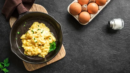 As discussed, eggs are sensitive to overcooking; a couple of degrees can turn your beautiful, soft, fluffy scramble into hard egg nuggets. This can even happen after the heat has been turned off via carryover cooking; it's why you should always undercook your eggs by just a little bit. The residual heat from the pan and within the eggs themselves continue to raise the temperature of the scramble. By adding a bit of cold butter or cream, you effectively shock the eggs and stop the cooking before you lose all your hard work. Child recommends no more than two tablespoons of either for an eight-egg scramble, as the intention is fluffy, creamy eggs and not soupy eggs.