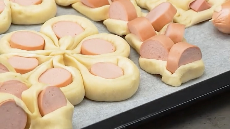 If this method is too complicated, you can make things simpler by rolling the whole sausages up in the dough. Then, cut them into six pieces and, sticking the dough together at the sides, place them in a flower shape on your baking sheet. Just note that with this method, the dough may not stick together as well, leading to individual pieces of wrapped sausage sliding around.