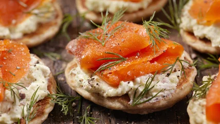 Unlike other types of cured salmon, smoked salmon undergoes an additional treatment process. It is cured in salt and then smoked. Smoked salmon also lasts about a week in the refrigerator once it's opened (up to three weeks if the package is unopened), but that smoking process creates an extra step that gives it a much different flavor than the others. The salmon is cured first to remove moisture, and seasonings can be used if desired. Then, it's rinsed to remove any remaining salt. Curing is important because it helps the salmon develop a coating that allows the smoke to infuse better. The salmon is then placed into a kiln, where wood chips infuse flavor. Oak, maple, and hickory are common wood types for this process.
