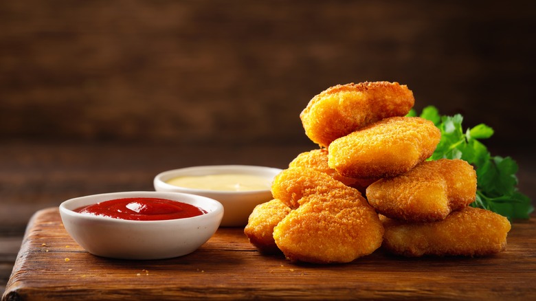 Although dinosaur-shaped nuggets are now commonplace, and perhaps the top choice of youth, chicken nuggets can, of course, take many shapes. Whether you prefer stars, cartoon characters, animals, round, oval, or sticks, nuggets are a dunkable treat that aren't going anywhere. While there may be debates around the best shape as it pertains to texture, surface area, crispy edges, meaty center, or dunkability, perhaps the winning argument simply goes to the dino fun factor. Plus, challenge any kid to a game of name that dinosaur, and you'll likely lose due to the educational value of this iconic gem. If you're up for another challenge, consider competing for the Guinness World Record for the most chicken nuggets eaten in one minute.