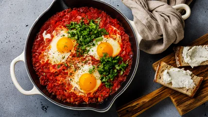 You also have a lot of options when it comes to spices. If you're aiming for a more traditional meal, consider seasoning the dish with harissa, a North African chile paste. Harissa usually features ingredients like chile peppers, garlic, and olive oil. As for seasonings, harissa can include tasty additions like mint and cumin. Of course, you can also whip up a seasoning blend of your very own using a wide range of ingredients, including paprika, cayenne, turmeric, and even cilantro. Your spice blend is ultimately up to you and your taste preferences. Likewise, pairings for shakshuka can also vary quite a bit.