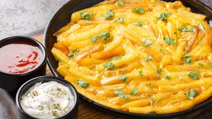 As you've probably gathered from the name, the hearty omelet trades diced or scalloped potatoes for fries, one of the few forms of the spud you might have never thought to have for breakfast. Some might add dimension to the heavy base ingredients of the popular street food by adding aromatics like onions, herbs, and Kashmiri chili powder, plus the optional vegetable or two.