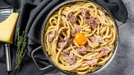 Carbonara is a classic, ready-in-no-time pasta dish that's easy enough to whip up once you've given it a few tries. Its ingredients are fairly simple and can be made mostly with things you already have in your pantry. Put simply, carbonara "sauce" is made by whisking eggs with pecorino romano, then using the heat from pasta water to create a creamy sauce and cook the egg slightly. Guanciale, or pig jowl, is traditionally added as well, though other fatty cured pork products such as pancetta or bacon are suitable substitutes. Of course, you'll want to choose the perfect pasta — something that the sauce can grip onto so that you get that delicious carbonara flavor in every bite.