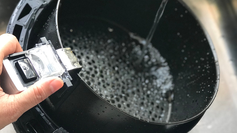 To clean your air fryer, simply wait for it to cool down after cooking, then submerge it in warm, soapy water in your sink. Scrub it down with a sponge until it's clean, making sure to get into all those nooks and crannies where excess grease may be hiding, then rinse and lay it out on a drying rack. Make sure to use a soft sponge or cloth to avoid damaging the stainless steel surface of your air fryer's basket, and never use a metal tool like steel wool.