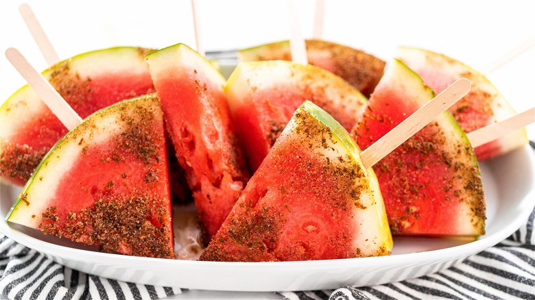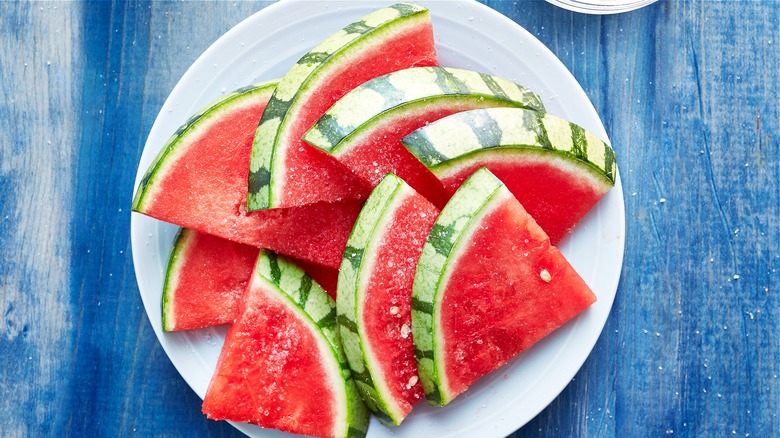 Believe it or not, many countries have added salt to watermelon for years. Historically, when we look at the countries that have long since enjoyed a version of this salty-sweet snack, many are considered warm-weather environments. Next to America's southern states, Japan is known for its harsh, humid summers. Countries like Mexico, Indonesia, and India tend to lean on the warmer side of the spectrum throughout the year. While watermelon is one of the most hydrating fruits available, more juice is created when a bit of salt is added to the surface. Whether you use table salt, Himalayan, or flaky granules, salt draws out watermelon's inner juices, making this fruit even more refreshing and satisfying for those in warm climates.
