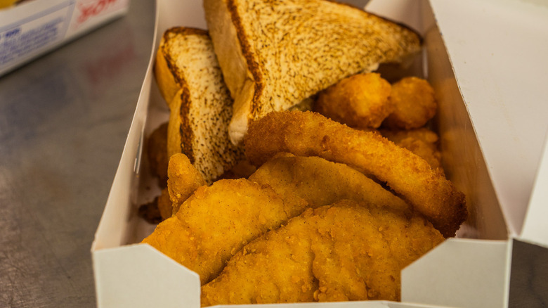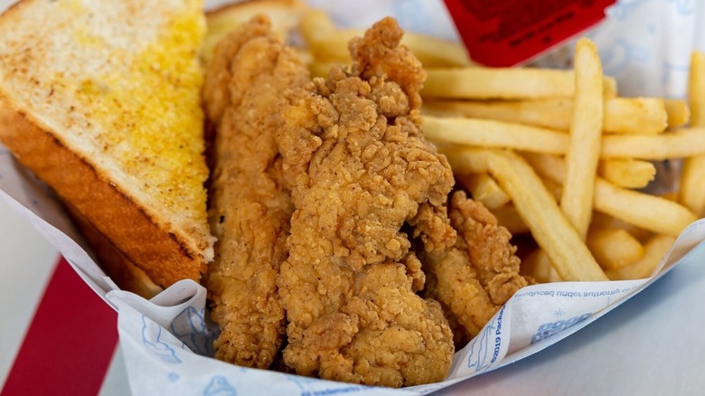 Since sauces are both moist and have flavor, the chicken is improved upon quite a bit by Whataburger's Spicy Ketchup or its barbecue sauce. And, being from Texas, the chain's Texas toast is pretty good and comes in a combo with the Whatachick'n Strips or if you specifically ask for it on the side. Unfortunately, that's the best thing I can say about the chicken tender basket at Whataburger, and it's not even about the chicken.