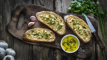 Though it might sound crazy, consider skipping the butter when making garlic bread. Although you might be accustomed to using melted butter or a butter spread, it isn't the only way. You can use olive oil instead for a rich and tasty outcome. Oil can be quicker, since you don't have to spend time softening or melting it. Moreover, it fully penetrates the bread, ensuring it's moist and doesn't dry out too much when baked.