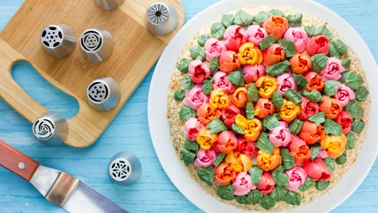 An easy way to make the flowers stick to the cake is to spritz its surface with water. Make sure to frost the cake with a color that blends well with the outward décor, so any unforeseen spaces or mishaps can blend in easily. Making tiny leaves with a leaf tip will also help to hide any discrepancies while playing up the nature-inspired look. Don't be afraid to experiment with color combinations. Real flowers often display a range of colors fading in and out. Hence, you can line your piping bag with layers of different colors or mix them up to mimic the beauty of real flowers. Russian piping tips can be found and ordered online easily, so grab some for your next baking project.