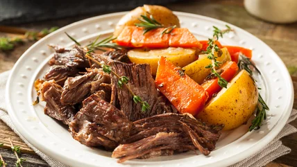 You'll also have a delicious meal if you make a beef brisket pot roast. Brisket comes from the chest area of the cow, an area that is tough and strong because it supports a lot of the cow's weight. Beef brisket has slightly more marbling, which means it'll be super flavorful when cooked low and slow for a melt-in-your-mouth pot roast.