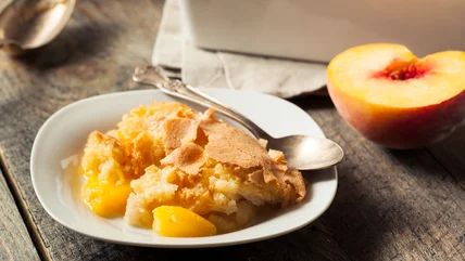 You may be wary of using frozen fruit in this case, as frozen fruit can make your dessert more runny, but with a few extra steps, you can make sure your peach cobbler filling maintains a good texture. You can toss the frozen peaches as is into your baking dish for your cobbler filling if you're short on time. But for peach cobbler, it's best to thoroughly thaw the peaches first. Thaw them in the refrigerator for six to eight hours, then pat them completely dry and drain as much of that extra liquid as possible. If you skip the thawing and drying, that extra liquid will melt away from the fruit while baking and could make your filling too watery.