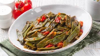 Picture a Romano bean like a standard string bean that's been flattened out with a rolling pin. The exterior is still a vibrant green, but the shape is wider, similar to that of a snap pea. And while green beans wilt and soften during a slow roast, Romano beans maintain their tenderness. The flatter, supple Romano beans turn meaty instead of mushy, easily absorbing any juicy flavors you cook them in. So, if you're looking for a type of green bean that switches up your usual vegetable side dish routine and can stand to handle slow cooking, try incorporating Romano beans.