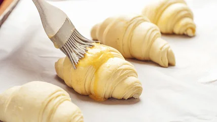 An egg wash brings a shine to the surface of baked foods from sweet treats to savory breads, and acts as a natural glue for embellishments such as sesame or poppy seeds on burger buns, or pearl sugar on pastries. An egg wash also works as a seal for seams on foods like hand pies and filled pasta like ravioli. Egg wash helps breading adhere to cutlets, chicken, or breaded vegetables; and creates an enhanced golden exterior on a chicken. A well-blended egg wash is important for consistency; when applying, if some spots have a heavier amount of wash, they may also brown faster or even burn. In general, a thin coat of egg wash is the best practice.