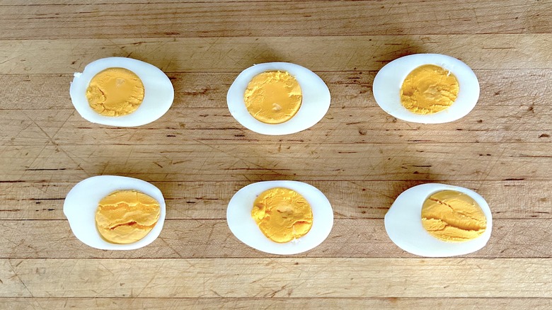One of the most common mistakes people make with cooking hard-boiled eggs is using super fresh eggs straight from the farmer's market. These are notoriously hard to peel, so I always use slightly older eggs for hard-boiling. My chef-approved hard-boiling method itself is standard. I place the eggs at the bottom of a saucepan and cover them with cold water. I put a lid on the saucepan and bring the water to a rolling boil. Once the water has boiled, I turn off the burner and allow the eggs to sit for 12 minutes. I then drain, rinse, and soak them in cold water for 30 minutes. Once they have cooled, I pat them dry and place them in the refrigerator for 30 minutes before endeavoring to peel them.
